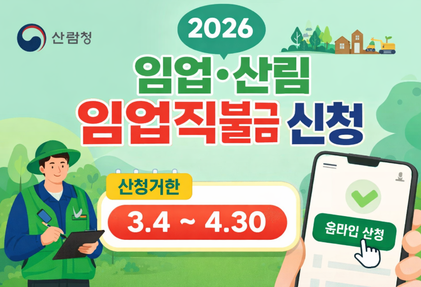 2026년 임업직불금 신청이 시작됩니다. 산림청은 2026년 임업·산림 공익직접지불금 신청·접수를 3월 4일부터 4월 30일까지 진행한다고 밝혔습니다. 온라인 신청, 모바일 간편신청, 읍·면·동 방문 신청 일정이 각각 다르므로 본인에게 맞는 접수 방식을 먼저 확인하는 것이 중요합니다.
